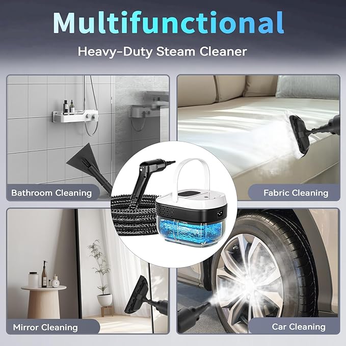 - 【Core Performance】: This handheld steam cleaner is equipped with a 2500W motor, generating 100BAR pressure and 160°C (322°F) high-temperature steam in just 15 seconds. Its nozzle offers 3-level steam adjustment for precise output control, no need to pause cleaning to adjust settings. The unit has a steam shut-off function: press and hold to switch to “Off”, and residual steam in the hose dissipates fully within 5 seconds. The transparent, high-strength water tank lets users easily monitor remaining water.