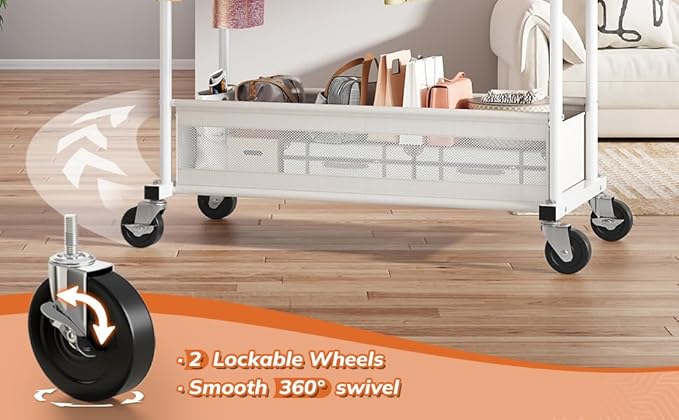 - Wide Applications: This space-saving clothing rack is ideal for use in the bedroom, living room, laundry room, or entrance. It features 360-degree rotating wheels that glide smoothly on any floor surface. It also serves as a portable wardrobe for clothing stores, rental homes, and apartments.