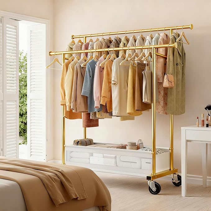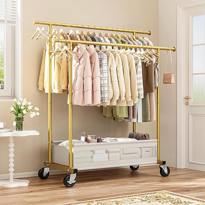 - Sturdy & Heavy-Duty: Unlike ordinary garment racks, Snhomee is crafted from premium, industrial-grade steel. The double-rod clothes rack design comfortably holds your everyday wardrobe or bulky winter coats on both tiers without bending, with each rack seamlessly connected for enhanced stability and relentless strength.