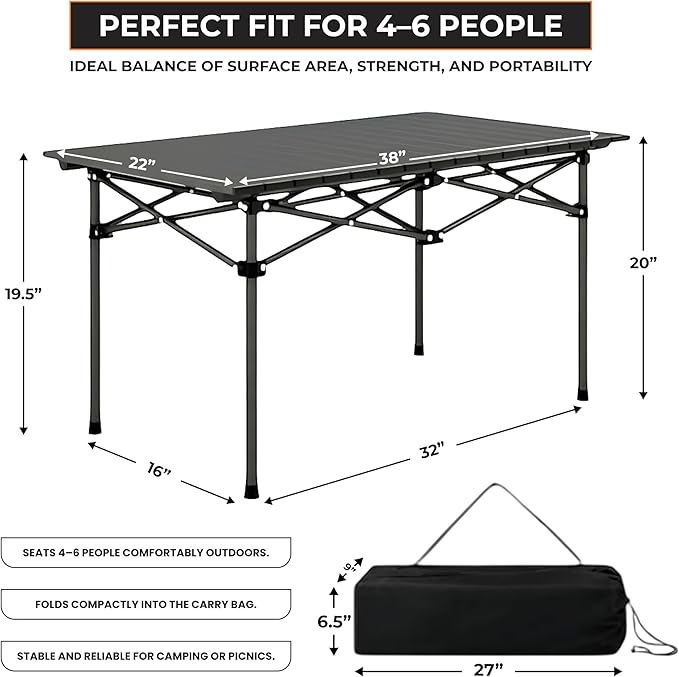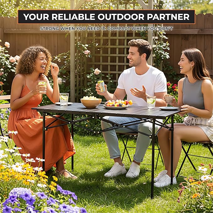 - Easy to Set Up & Fold: This portable table roll-up aluminum tabletop and folding frame allow quick, tool-free assembly, & this folding outdoor table is compact for storage, making setup and packing effortless for all your outdoor adventures.