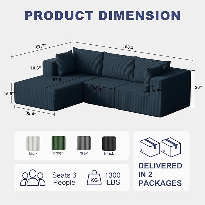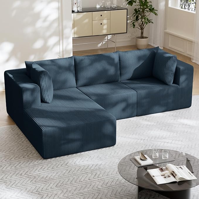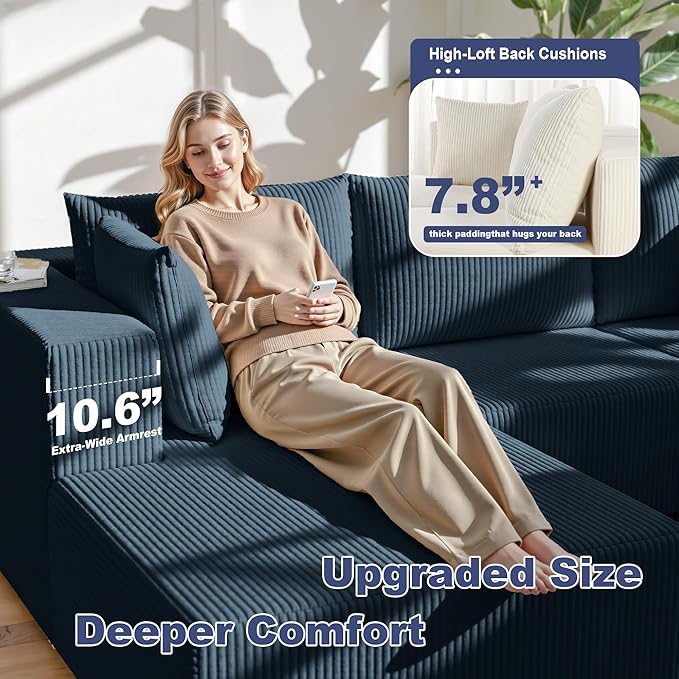 108" Boneless Couches for Living Room, Modular Cloud Couch Sofa - L Shap Corduroy Sectional Sofa, Fluffy Memory Foam Sleeper Sofa Furniture, No Assembly, Wide Armrest, Navy Blue
