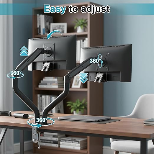 - Flexible Adjustability: This dual-screen stand features a gas spring adjustment system that supports tilt, swivel, and rotation. Users can easily adjust both monitors to the ideal angle for collaborative work, video playback, or content creation