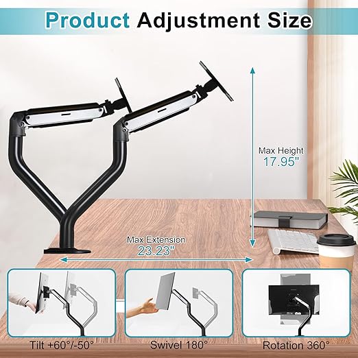 - Flexible Adjustability: This dual-screen stand features a gas spring adjustment system that supports tilt, swivel, and rotation. Users can easily adjust both monitors to the ideal angle for collaborative work, video playback, or content creation