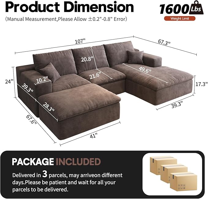 - 3 Boxes Home Delivery:The modular sectional sofa is delivered in 4 separate boxes, allowing for easy transport through tight hallways or narrow doorways Please note, the boxes may arrive on different days
