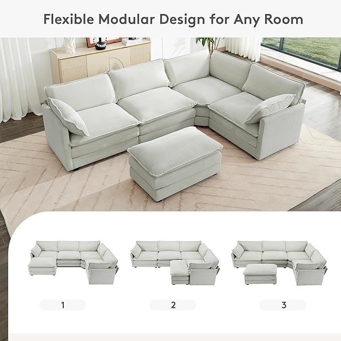 ROWHY 113'' Modular Sectional Cloud Corner Couch, 5 Seater L Shape Sofa Big Comfy Corduroy Oversized Couch with 2 Pillows Movable Ottoman, Deep Seat Sectional Couches for Living Room Office Light Grey